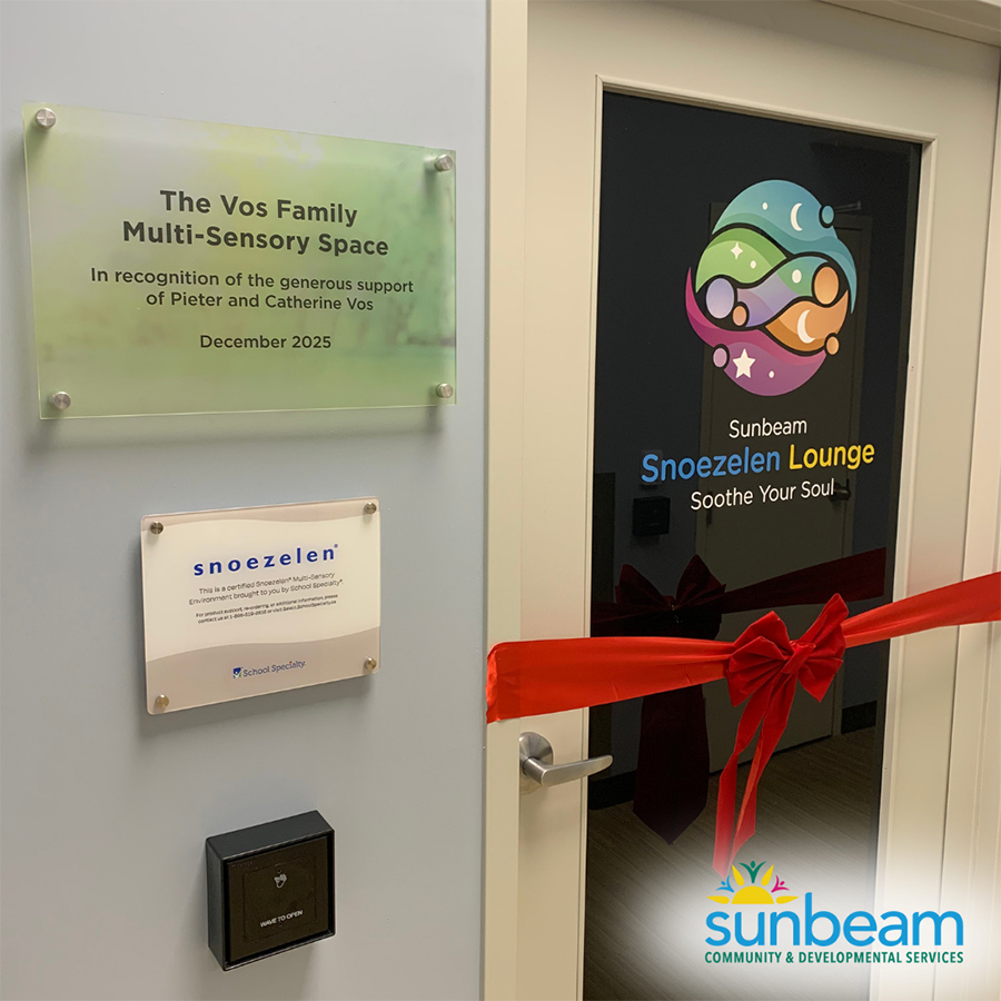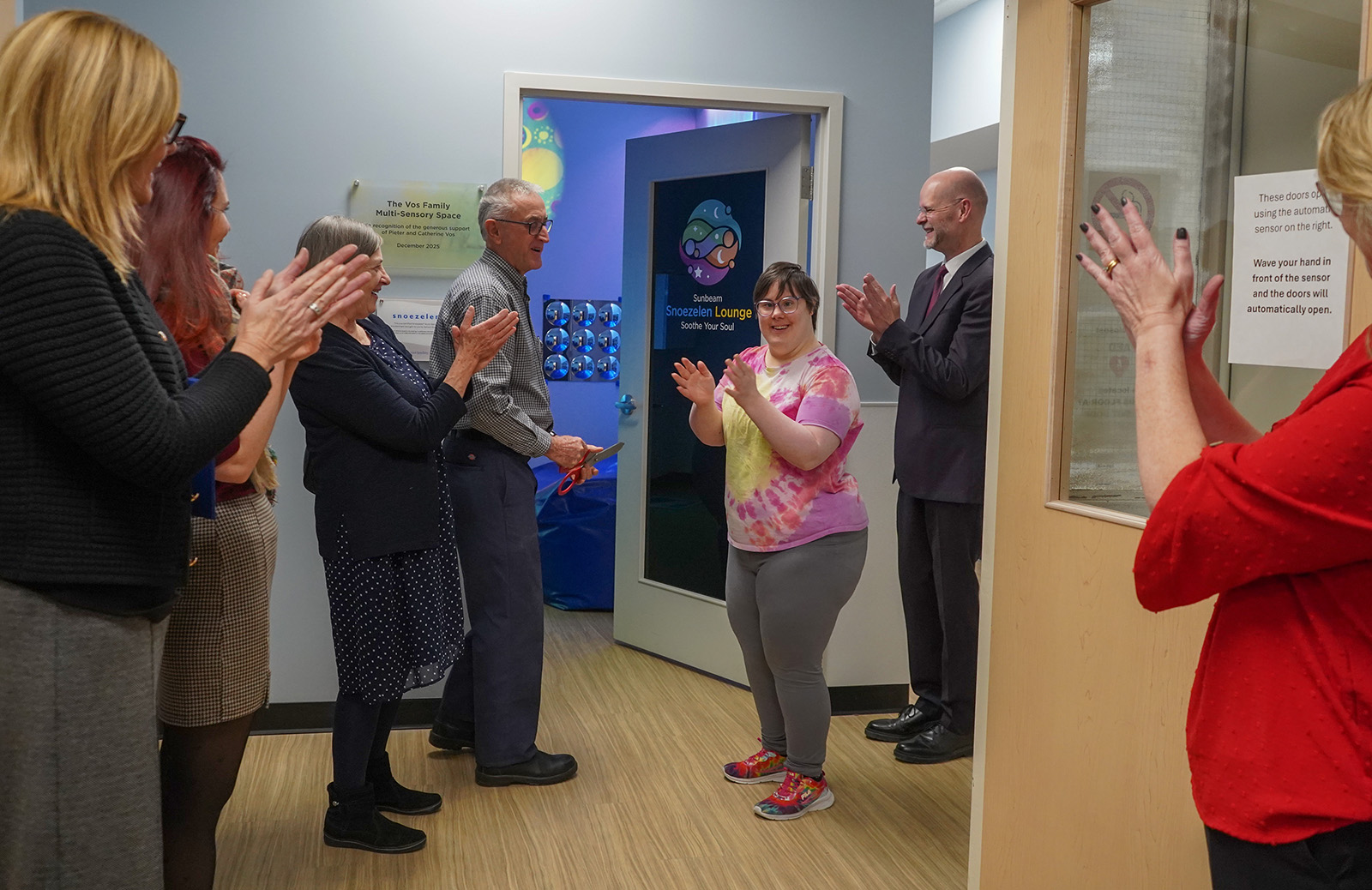 The ribbon cutting ceremony was attended by members of Vos family, local dignitaries, people supported by Sunbeam and members of Sunbeam’s Board of Directors. Through the generosity of our community, and Pieter and Catherine Vos, this new space helps create environments where individuals can feel safe, soothed, and inspired every day.